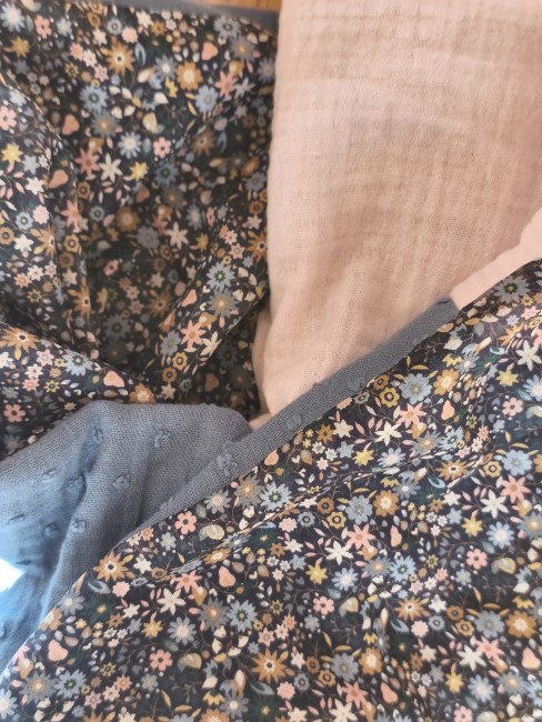 Cet article est confectionné avec 3 tissus (voile de coton et double gaze).