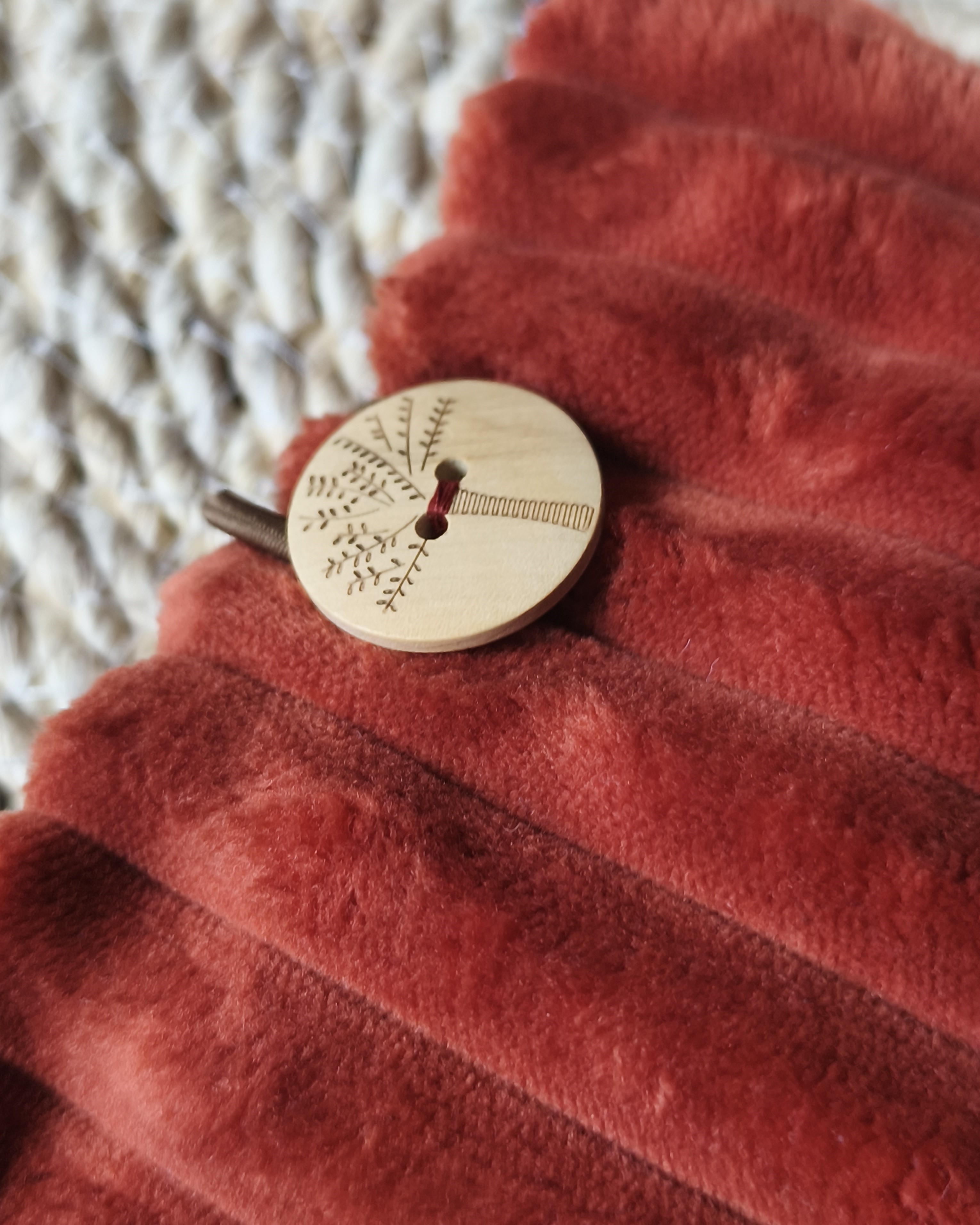 La pochette livre se ferme par une élatique de couleur coordonnées à la pochette et un bouton en bois