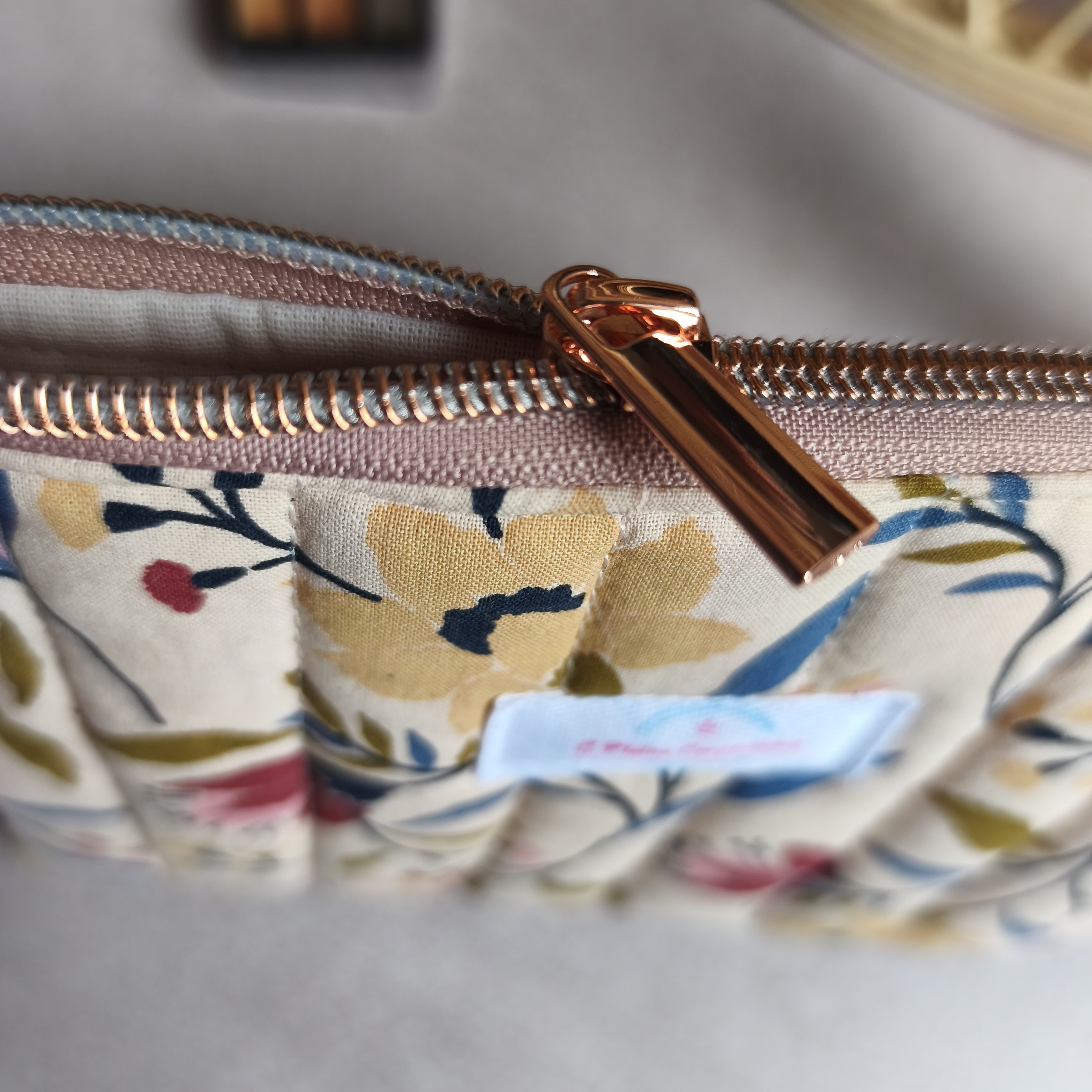 Découvrez cette pochette plate matelassée, idéale comme trousse à maquillage ou pochette de rangement. Confectionnée à la main, elle associe l’élégance du coton imprimé à une doublure en coton doux, pour un accessoire à la fois pratique, durable et raffiné.